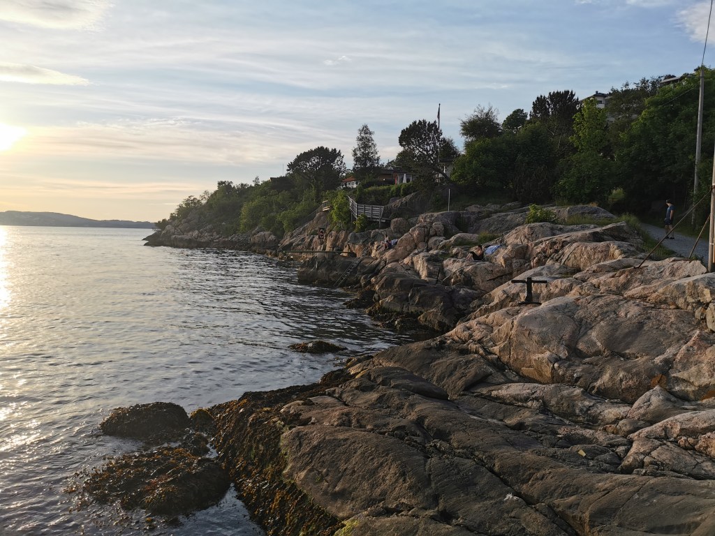 I Biskopshavn kan man ligge mange timer på varmt berg, selv etter en lang arbeidsdag. Solen holder akkurat så lenge at man likevel kommer seg skapelig i seng, og er perfekt om man trenger litt helgefølelse midt i uken. Berget er akkurat så krikete og krokete at man kan ligge i fred og lytte til måser og skvulping selv når det er mange der, og det finnes nok av hyller man kan slange seg på.